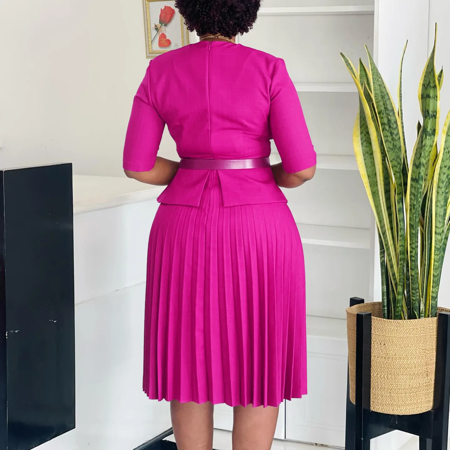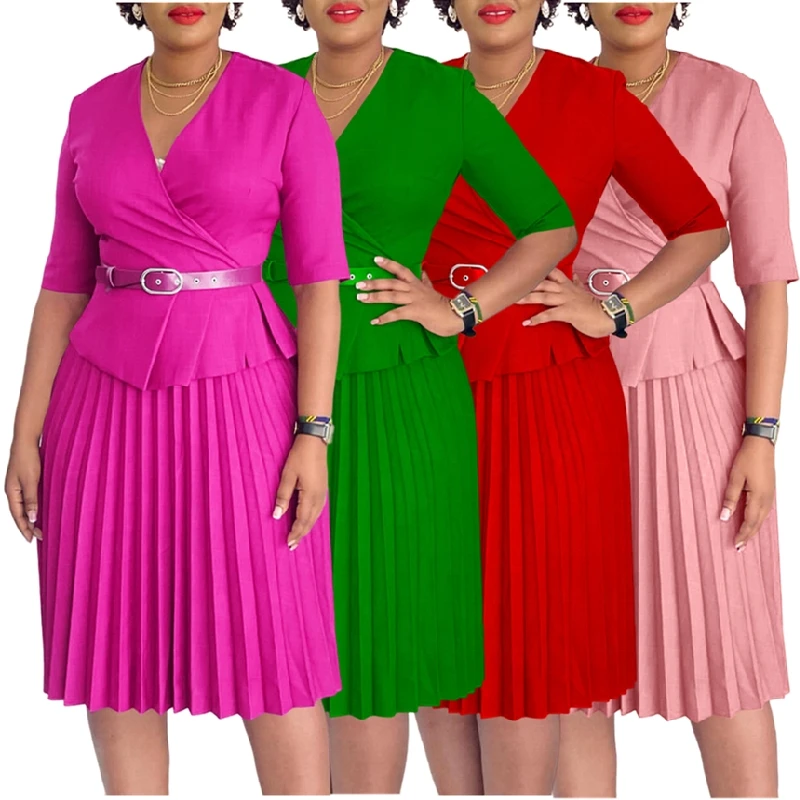 D520 Latest Design Ladies Office Dresses Women Casual Elegant Half Sleeve V-neck Pleated Women Church Dresses With Belt